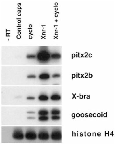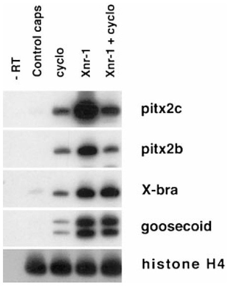 goosecoid, pitx2b, pitx2c, and histone H4. While Xnr-1 induces