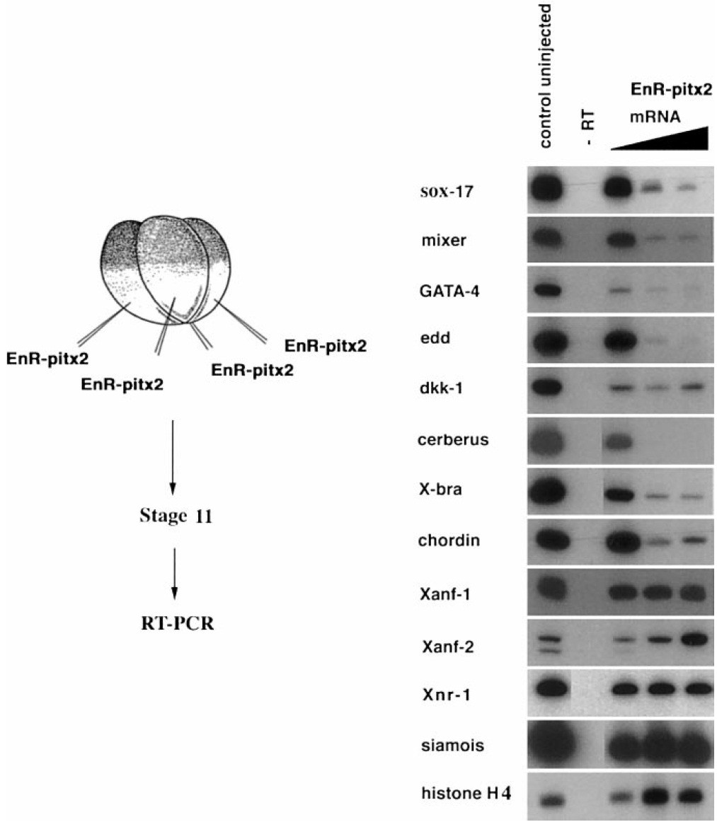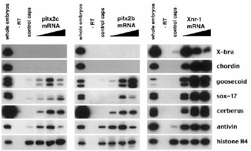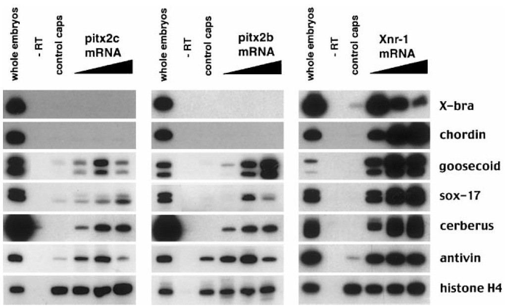 reverse transcription. pitx2 dose-dependently induces goosecoid, sox17b, cerberus, and antivin but not Xbra or chordin. These results are