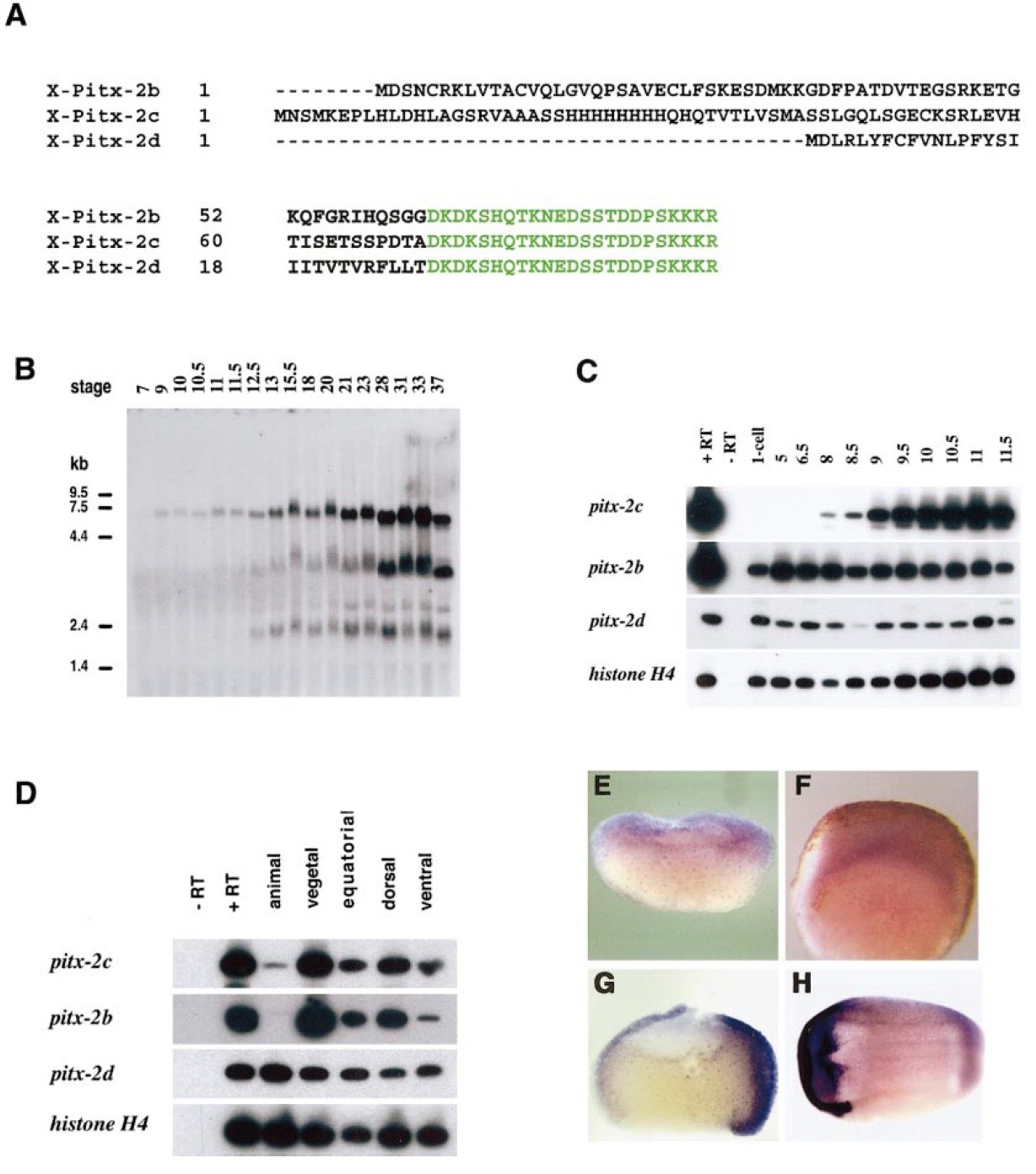 FIG. 1. Early expression of pitx2 transcripts during Xenopus development. (A) Deduced N-terminal sequences of three Pitx2 isoforms. The