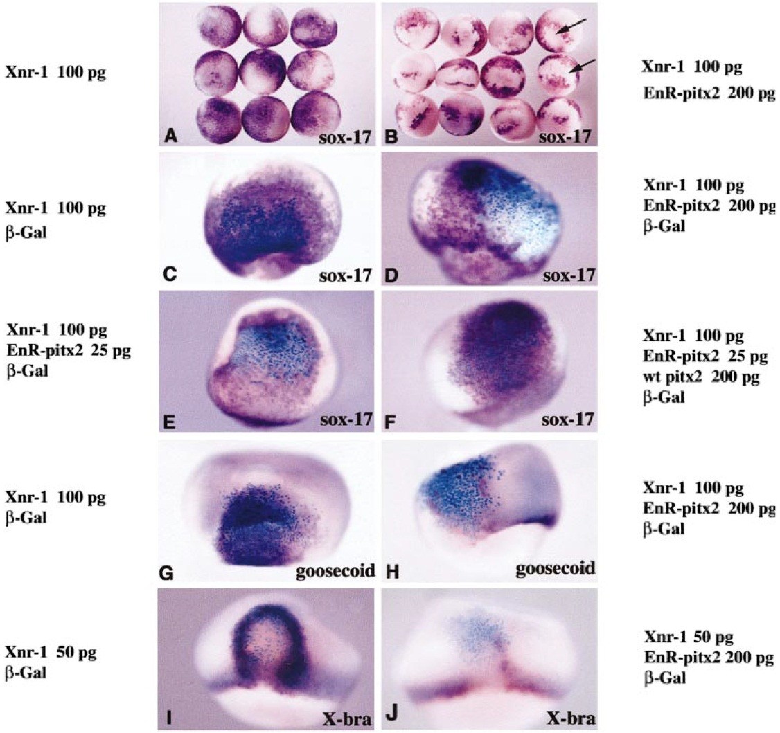 EnR-pitx2 RNA with 100 pg of Xnr-1 into one blastomere at the four-cell stage. (F) Reversal of the effect by co-injection of 25 pg of EnR-pitx2