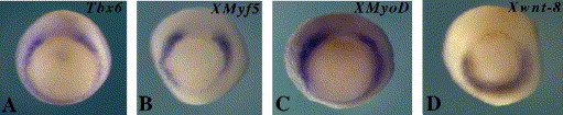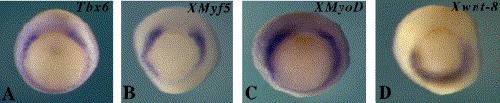 Fig. 1. Overlapping expression of Tbx6, XMyf5, XMyoD and Xwnt8 at the early gastrula stage analyzed by in situ hybridization. (A) Tbx6 is expressed in the lateral and ventralmesoderm of early gastrula. (B) XMyf5 shows similar expression pattern but is expressed at a lower level in the most ventral region. (C) XMyoD is expressed in a very similar pattern as Tbx6. (D) The expression of Xwnt8 is localized to the ventral region with a relatively lower level in the lateralmesoderm. The expression of all four genes is excluded in the dorsal region.