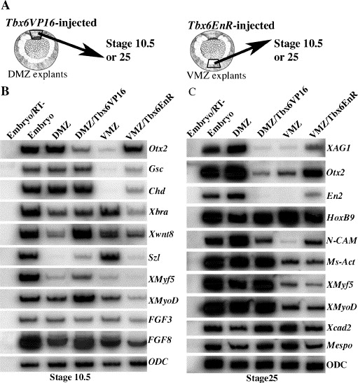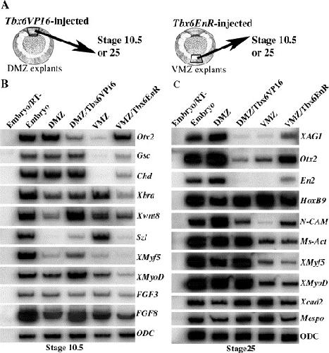 Fig. 2. Regulation of mesodermal and neural gene expression by Tbx6 in marginal zone explants. (A) Embryos at 4-cell stage were injected with Tbx6VP16 mRNA in the DMZ region or with Tbx6EnR mRNA in the VMZ region. Injected embryos were cultured to early gastrula stage for dissection of DMZ and VMZ explants. (B) Gene expression in DMZ and VMZ explants at the early gastrula stage. Tbx6 inhibits the expression of dorsal genes like Otx2 and induces the expression of ventral genes like Xwnt8 and szl in the DMZ explants. In contrast, Tbx6EnR induces the expression of dorsal genes like Otx2 in the VMZ explants, whereas it inhibits the expression of latero-ventral genes including Xbra, szl, Xwnt8, XMyoD and FGF8. (C) Gene expression in DMZ and VMZ explants expressing Tbx6VP16 or Tbx6EnR at early tail-bud stage. Tbx6 inhibits the expression of Otx2 and N-CAM, but up-regulates posterior genes Hoxb9, Xcad2 and Mespo in DMZ explants. Tbx6EnR induces the expression of neural markers XAG1, Otx2, En2 and N-CAM in VMZ explants, while it inhibits the expression of posterior genes including Hoxb9, Xcad2 and Mespo.