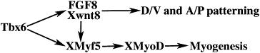 Fig. 9. Regulatory hierarchy in posteriormesoderm specification and myogenesis involving Tbx6, FGF8, Xwnt8 and XMyf5. Tbx6 functions upstream of these genes in both processes (see Discussion for detail).