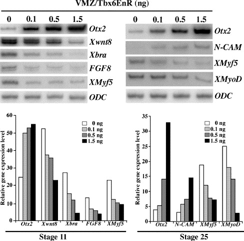 Fig. 3. Dose-dependent effect of Tbx6EnR on gene expression. Following injection of different amounts of Tbx6EnR mRNA in the ventral region at 4-cell stage, VMZ explants were dissected and RT-PCR was performed at stage 10.5 and 25. The intensity of each PCR product was normalized to ODC. This experiment was performed in triplicates with similar result.
