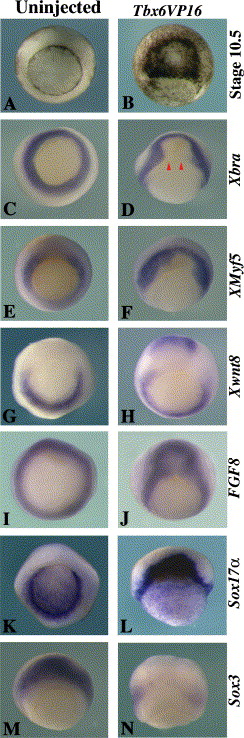 Fig. 4. Expression of mesoderm, endoderm and neural markers in Tbx6VP16-injected early gastrula. Embryos at 4-cell stage were dorsally injected with Tbx6VP16 mRNA and cultured to early gastrula stage for in situ hybridization. (A) Vegetal view of an uninjected early gastrula. (B) Dorso-vegetal view of a Tbx6VP16-injected early gastrula with a condensation of pigmentation near injection sites. (C) Expression of Xbra in an uninjected early gastrula. (D) A Tbx6VP16-injected early gastrula showing a shift of Xbra expression domain to more anterior region. Arrowheads indicate the blastopore. (E) XMyf5 expression in an uninjected early gastrula. (F) Ectopic expression of XMyf5 in the dorsal region induced by Tbx6VP16. (G) Xwnt8 expression in an uninjected early gastrula. (H) Ectopic expression of Xwnt8 in a Tbx6VP16-injected early gastrula. (I) FGF8 expression in an uninjected early gastrula is localized to the entire marginal zone. (J) Dorsal injection of Tbx6VP16 shifted FGF8 expression to a more anterior region. (K) Sox17α expression is located in the yolk plug and latero-ventral blastoporal lip with lower level in the dorsal region. (L) Tbx6VP16 strongly induces ectopic Sox17α expression in the dorsal region. (M) Expression of the neural marker Sox3 in the dorsal ectoderm of an uninjected early gastrula. (N) Absence of Sox3 expression in the dorsal ectoderm following injection of Tbx6VP16.