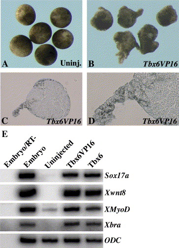 Fig. 5. Mesoderm and endoderm induction in ectoderm explants by Tbx6. Embryos at 4-cell stage were injected with Tbx6VP16 or Tbx6 mRNA in the animal pole region and ectodermal explants were cultured to stage 14. (A) Control uninjected explants. (B) Tbx6VP16-injected explants show elongation and protrusions. (C) Section from a Tbx6VP16-injected explant, low magnification. (D) Section from a Tbx6VP16-injected explant, high magnification. (E) RT-PCR analysis of mesoderm and endoderm markers. Both Tbx6VP16 and Tbx6 induce the expression of endodermal marker Sox17α in addition to latero-ventralmesoderm markers.