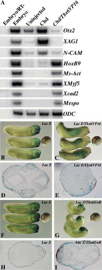 Fig. 6. Tbx6 inhibits neural induction in vitro and in vivo. (A) Tbx6 counterbalances the neuralizing activity of chordin. Embryos were injected with indicated mRNA and ectodermal explants were cultured to stage 25 for RT-PCR analysis. Overexpression of chordin induces the expression of anteriorneuroectoderm markers Otx2 and XAG1, as well as the pan-neural marker N-CAM. Coexpression of Tbx6VP16 with chordin strongly inhibits neural induction and induces the expression of different posteriormesoderm markers including Hoxb9, Xcad2 and Mespo, in addition to somitic mesoderm markers muscle actin and XMyf5. LacZ mRNA was either injected alone or coinjected with Tbx6VP16 or with Tbx6EnR mRNA in the indicated region at 8-cell stage. (B) Distribution of βgal-stained cells in the head and ventral regions in embryos injected with LacZ mRNA alone in the animal pole region of the two dorso-animal blastomeres. (C) Distribution of βgal-stained cells in the trunk region and somitic mesoderm following coinjection of LacZ mRNA with Tbx6VP16 mRNA in the animal pole region of the two dorso-animal blastomeres. (D) Section at the head region of an embryo in panel B. (E) Section at the trunk region from an embryo in panel C. (F) βgal-stained cells are populated to the head region and somitic mesoderm when LacZ mRNA is injected alone in the marginal zone of the two dorso-animal blastomeres. (G) Coinjection of Tbx6EnR mRNA with LacZ mRNA in the marginal zone of the two dorso-animal blastomeres prevents somitic distribution of βgal-stained cells. (H) Section at the trunk region from an embryo in panel F. (I) Section at the head region from an embryo in panel G.