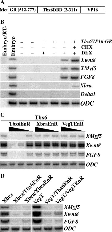 Fig. 7. Identification of Tbx6 direct targets genes. (A) Schematic representation of the inducible construct. (B) Embryos at 4-cell stage were injected with Tbx6VP16-GR mRNA and ectodermal explants were dissected and cultured to stage 10.5. Both uninjected and injected explants were treated with cycloheximide (CHX) or dexamethasone (DEX), or both, for 1.5 h. The expression of a panel of mesoderm and endoderm markers was analyzed by RT-PCR. Among these genes, the expression of FGF8, Xwnt8 and XMyf5 was rapidly and specifically induced and was not blocked in the presence of CHX. (C) Tbx6-induced expression of XMyf5, Xwnt8 and FGF8 was blocked by Tbx6EnR in a dose-dependent manner, but not by XbraEnR and VegTEnR. (D) Tbx6EnR strongly blocks the expression of XMyf5, Xwnt8 and FGF8 induced by Xbra and VegT. XbraEnR and VegTEnR also block the activity of Xbra and VegT, respectively.