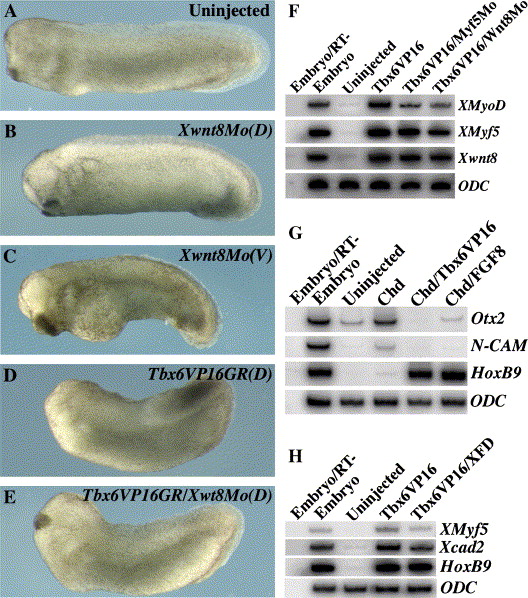 Fig. 8. Functional interaction between Tbx6, FGF8, Xwnt8 and XMyf5. (AâD) Interaction between Tbx6 and Xwnt8 in anteroposterior patterning. Embryos were injected at 4-cell stage and cultured to stage 35. (A) A control embryo. (B) dorsal(C) A Xwnt8Mo-injected embryo in the ventral region with enlarged head and shortened anteroposterior axis. (D) A Tbx6VP16-GR-injected embryo incubated in DEX at stage 11 shows anterior deficiency at stage 35. (E) Coinjection of Xwnt8Mo with Tbx6VP16-GR mRNA rescues head development. (F) Interaction between Tbx6, Xwnt8 and XMyf5 in myogenesis. Embryos were injected at 2-cell stage and animal cap explants were cultured to stage 11 for RT-PCR analysis. Inhibition of Xwnt8 and XMyf5 activity strongly inhibits XMyoD expression induced by Tbx6VP16. (G) FGF8 exhibits similar activity as Tbx6VP16 in inhibiting neural induction in explants cultured to stage 25. A dominant negative FGF receptor (XFD) inhibits XMyf5 and Xcad2 expression induced by Tbx6VP16 in explants cultured to stage 25.