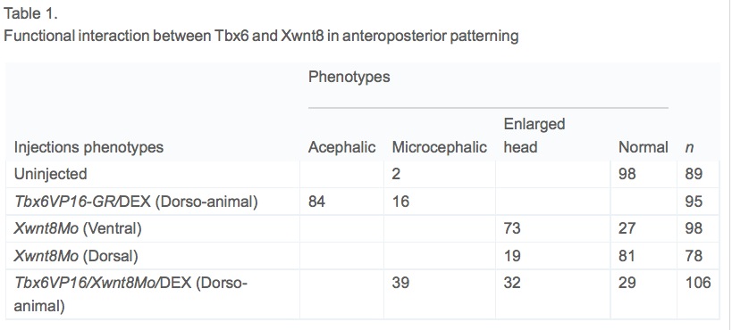Table 1. Functional interaction between Tbx6 and Xwnt8 in anteroposterior patterning. Embryos were injected at 4-cell stage and cultured to stage 35 for score of phenotypes. Acephalic embryos show absence of cement gland and eyes, microcephalic embryos exhibit reduced head structures with smaller cement gland and eyes, and embryos with enlarged head display strongly dorsalized phenotype with enlarged cement gland and reduced trunk and posterior regions. The results were expressed as percentage, except n, which refers to total embryos scored from three independent experiments.