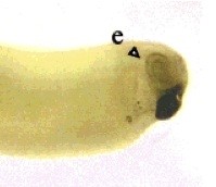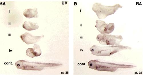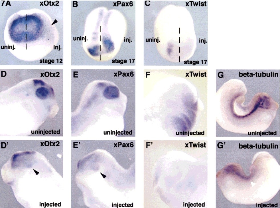 Xenopus Pitx1 is a homeobox gene whose family members are structurally and functionally conserved in organisms as diverse as Drosophila, chick, mouse, human, and frog. Present as a maternal transcript, the gene is zygotically expressed during gastrulation in a dorsal streak of cells. This streak restricts to a small circular domain underlying the center of presumptive neural plate. Shortly thereafter, a crescent of expression develops at the border of anterior neural ectoderm, and as the central plate domain diminishes, the crescent coalesces to define the presumptive cement gland. Expression remains high throughout cement gland development, and subsequently expands to include ectodermal cells involved in stomodeal invagination. During early organogenesis, expression ensues in developing eye, posterior lateral mesoderm, and first branchial arch derivatives. Ectopic expression of xPitx1 causes head deformities including enlarged cement gland, ectopic cement glands, and posterior deformities or, in extreme cases, inhibition of recognizable structures posterior to the cement gland. Expression of markers such as XCG-1, xOtx2, xPax6, neuralbeta tubulin, and xTwist suggest that increases in cement gland and lower mandibular size are likely at the expense of other head tissues. Paradoxically, overexpression is sufficient to partially rescue embryos that are axially perturbed by ultraviolet irradiation or retinoic acid administration. Ectopic expression of xPitx1 in ectodermal explants directly promotes cement gland development as there was no evidence that mesodermal or neural tissue was present in explants.