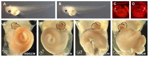 Fig. 5. XCR2 MO disturbs randomization of left-right asymmetric patterning of the heart and gut in stage 45-46 embryos. (A) Embryo injected with 50 ng of a standard control MO (SC MO). (B) Embryo injected with 50 ng of XCR2 MO. (C-H) Embryos injected with MO into the marginal region of both blastomeres at the two-cell stage, immunostained with MF 20 antibody, and the signal detected by fluorescence (C,D) or DAB staining (E-H). (C,E) Embryo injected with 50 ng of SC MO, showing normal left-right asymmetric patterning of the heart (C,E) and gut (right origin and counterclockwise coil, RO/CCW) (E). (D,F-H) Embryos injected with 20 ng of XCR2 MO. (D) Reversed morphology of heart. (F) Embryo has a mirror-imaged heart and gut (the left origin and clockwise coil, LO/CW). (G) Embryo has a normal heart, and left origin and counterclockwise-coiled gut (LO/CCW). (H) Embryo has reversed heart, right origin and clockwise-coiled gut (RO/CW).