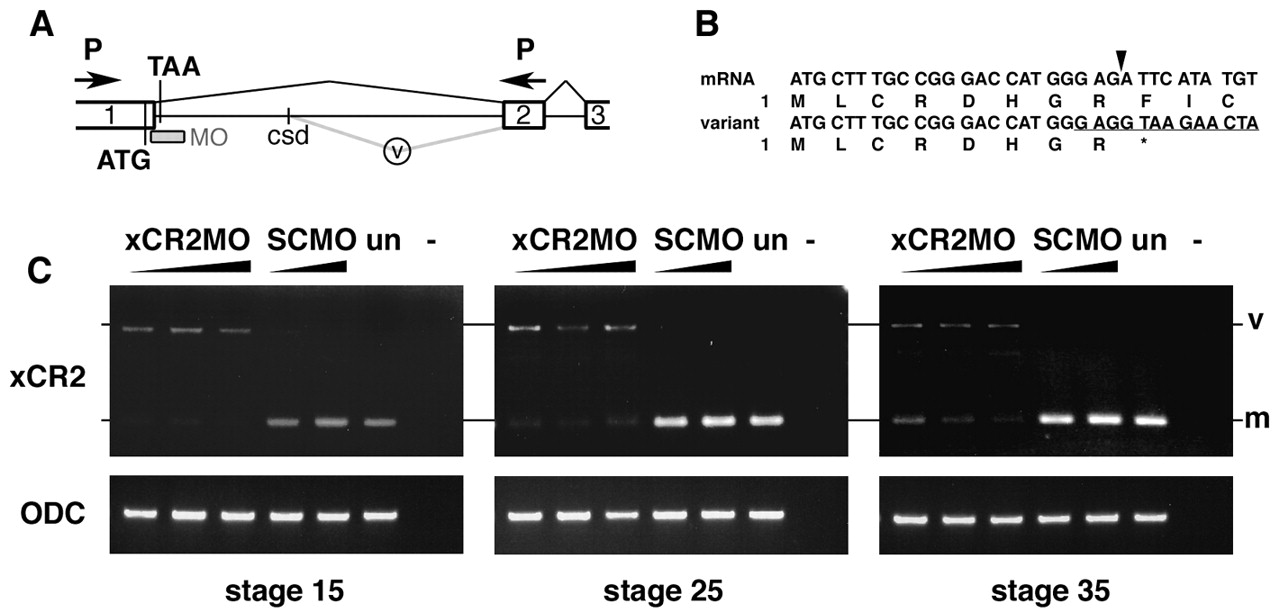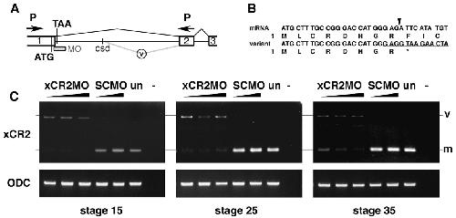 Fig. 4. XCR2 MO blocks endogenous RNA splicing. (A) Genomic structure including exon I (1), exon II (2), and exon III (3) of XCR2. The translation initiation codon (ATG) and a potential termination codon (TAA) are indicated. The splice-site-targeted antisense morpholino oligonucleotide XCR2 MO (MO) was designed against the sequence at the boundary of exon I/intron I. Abnormal splicing detected in XCR2 MO-injected embryos is shown by the gray line (v). The spliced variant is generated by a cryptic splice donor (csd) site 642 bp downstream from the end of exon I. (B) Sequence comparison of cDNA from mature mRNA and the aberrant splicing variant. Amino acid sequences are also indicated. The variant generated by abnormal splicing has a termination codon (correspondent to TAA in Fig. 4A) right after the end of exon I. Arrowhead indicates the correct exon I/exon II splice junction. The target sequence of XCR2 MO is underlined. (C) RT-PCR analyses of XCR2 mRNA in XCR2 MO-injected embryos. Embryos were injected with 10, 20 and 50 ng of XCR2 MO, or 20 and 50 ng of Standard Control MO (SC MO), and harvested for RT-PCR at stage 15, 25 and 35. The primer set was designed to span the first intron to detect splicing of the endogenous XCR2 pre-mRNA. In XCR2 MO-injected embryos, the mature mRNA (m) was decreased and an abnormal splicing variant (v) was detected. At stage 35, the mature XCR2 mRNA was detectable at low levels in embryos injected with lowest dose (10 ng) of XCR2 MO.