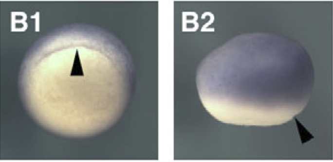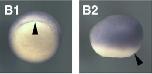 tdgf1.3 (teratocarcinoma-derived growth factor 1, member 3) gene expression in Xenopus laevis embryo, assayed via in situ hybridization, NF stage 10, blastoporal viw (B1 on left ) and lateral view, anterior right ( B2).