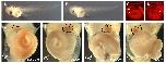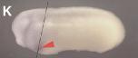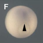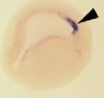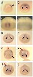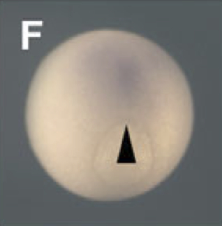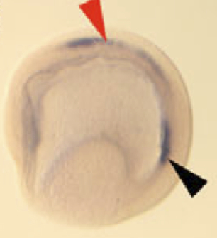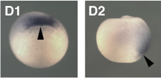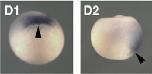 tdgf1.1 (teratocarcinoma-derived growth factor 1, member 1) gene expression in Xenopus laevis embryo, assayed via in situ hybridization, NF stage 12, blastoporal view, dorsal up (D1 left), and lateral view (D2 left).