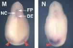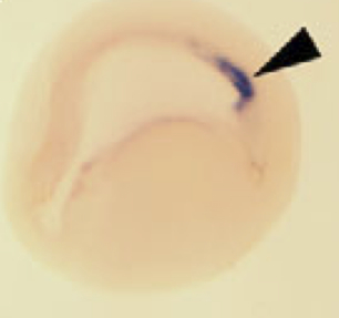 nodal1 ( nodal homolog 1) gene expression in a bisected Xenopus laevis embryo, assayed via in situ hybridization, NF stage 20, dorsal left.