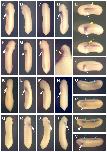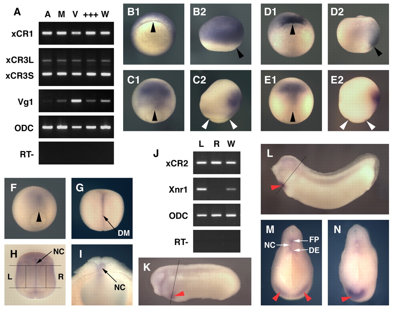 Fig. 2. Spatial expression patterns of Xenopus EGF-CFC genes. (A) Spatial expression patterns of XCR1, XCR3S and XCR3L at stage 9, as determined by RT-PCR of the animal region (A), the marginal region (M), the vegetal region (V), a mixture of the dissected three parts (+++) and intact whole embryos (W). VG1 was used as a control for dissection. (B-I,K-N) Spatial expression analyses by in situ hybridization for XCR1 (FRL1; B,C), XCR3 (D,E) and XCR2 (F-I,K-N). (B1,D1) Stage 10+ in vegetal view. The dorsal side is up. (C1,E1,F,G) Stage 12 (C,E,F) and stage 15 (G) in dorsal view. The anterior side is up. (B2,C2,D2,E2) Stage 10+ (B,D) and stage 12 (C,E) in lateral view. The anterior side is up and the dorsal side is to the right. (H) Stage 20 in dorsal view. Embryo was cleared with benzyl benzoate/benzyl alcohol. Lines show the left (L) and right (R) dissection model for RT-PCR (J). (I) Transverse bisected embryo at stage 20. (J) RT-PCR of the left lateral region (L), the right lateral region (R) and intact whole embryos (W) at stage 20. XCR2 was expressed bilaterally, whereas XNR1 was expressed on only the left side. (K) Stage 25. Line indicates the section plane shown in M. (L) Stage 30. Line indicates the section plane in N. (M,N) Transverse cut embryos at stage 25 (M) and stage 30 (N). Red arrowheads indicate the expression of XCR2 in the prospective heart region; black arrowheads indicate the dorsal lip; white arrowheads indicate the blastopore. DE, dorsal endoderm; DM, dorsal midline; FP, floorplate; NC, notochord.
