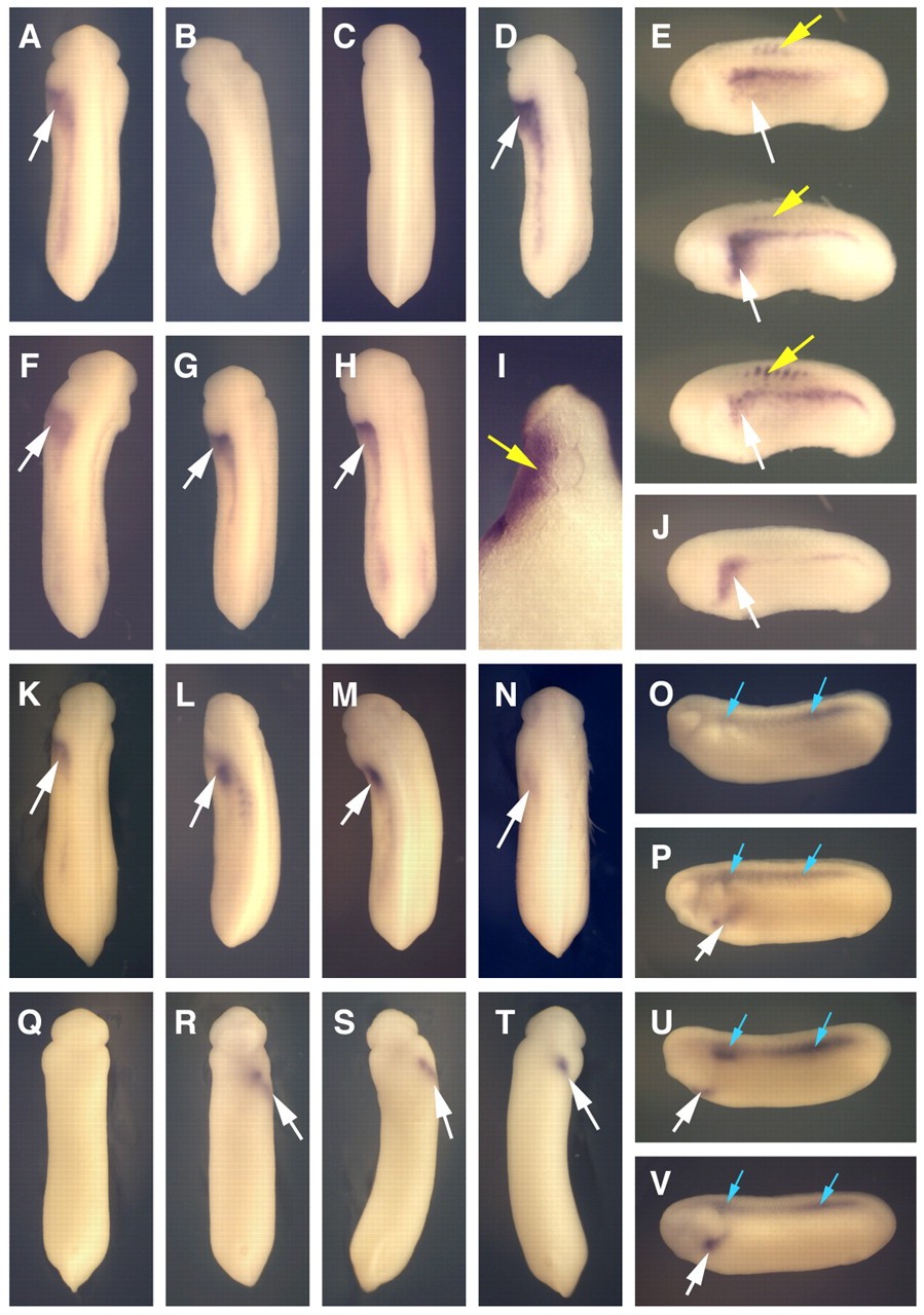 Fig. 6. Left-side injection of XCR2 MO inhibits XNR1 and XATV expression in the lateral plate mesoderm (LPM). (A-N) In situ hybridization of XNR1. White arrows indicate the expression of XNR1 in the LPM. (A) Embryo injected with 10 ng of SC MO into the left side, showing normal XNR1 expression. (B) Injection of 10 ng of XCR2 MO into the left side caused no expression of XNR1 in the LPM. (C) Co-injection of 10 ng of XCR2 MO with 10 pg of pCS-EGFP plasmid into the left side caused no expression of XNR1 in the LPM. (D,E,I) Co-injection of 10 ng of XCR2 MO with 10 pg of pCS-XCR2 plasmid into the left side rescued the expression of XNR1 in the LPM and also caused ectopic XNR1 expression in the somite (yellow arrows). (I) Transverse section of the rescued embryo. Ectopic XNR1 expression in the somite was observed. (F,G) Right-side injection of 10 ng of SC MO (F) or XCR2 MO (G) did not affect XNR1 expression. (H,J) Uninjected control embryo. (K-N) Co-injection of 10 ng of XCR2 MO with 10 pg of XCR1 (K), XCR3S (L), XCR3L (M) or human CFC1 (N) plasmid in the left side rescued the expression of XNR1 in the LPM. (O-V) In situ hybridization of XATV in ventral view. Arrows indicate the expression of XATV in the left LPM (white) and the dorsal midline (blue). (O,Q) Embryo injected with 10 ng of XCR2 MO in the left side inhibited the expression of XATV in the left LPM, but not in the dorsal midline. (P,R) Embryo injected with 10 ng of XCR2 MO in the right side, showing normal XATV expression. (S,U) Co-injection of 10 ng of XCR2 MO with 10 pg of pCS-XCR2 plasmid in the left side rescued the expression of XATV in the left LPM. (T,V) Uninjected control embryo.