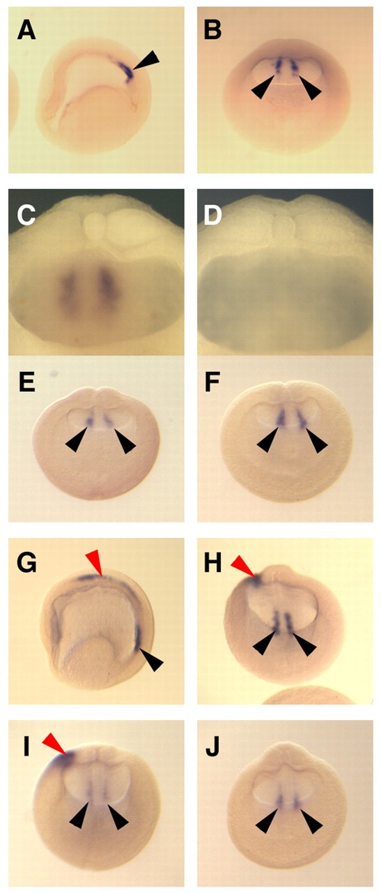 Fig. 7. Bilateral expression of XNR1 is not affected by XCR2 MO injection. (A-C) Normal expression pattern of XNR1 in the posterior archenteron roof at stage 15 as determined by in situ hybridization using uninjected embryos. Asymmetric expression of XNR1 was not observed at stage 15. (C) Posterior archenteron roof of half-dissected embryo in side view. Two stripes of bilateral XNR1 expression were observed. (D) In situ hybridization with an XNR1 sense probe. No signal was observed in the archenteron roof. (E,F) Injection of 20 ng of SC MO (E) or of XCR2 MO (F) into the marginal region of both blastomeres at the two-cell stage. The bilateral expression of XNR1 is not affected at stage 15 in either condition. (G,H) Normal expression pattern of XNR1 at stage 20. The bilateral expression is maintained (black arrowheads) and asymmetric expression appears in the LPM (red arrowhead). (I) Injection of 20 ng of SC MO does not inhibit either bilateral or asymmetric expression of XNR1 at stage 20. (J) Injection of 20 ng of XCR2 MO inhibited the asymmetric expression of XNR1, but not bilateral expression at stage 20. (A,G) Lateral views. The anterior side is to the left. (B,E,F,H-J) Posterior views. The dorsal side is up. The embryo was cleared with benzyl benzoate/benzyl alcohol (A,B,E-J). Black arrowheads indicate the bilateral expression of XNR1; red arrowheads indicate the asymmetric expression of XNR1.
