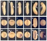 Fig. 8. Right-side overexpression of XCR2 causes left-right inverted gene expression. (A-D,G-I,M-O) In situ hybridization of XNR1 in dorsal view (A-D,G,I,M,O), anterior side at top, and in side view of a half-dissected embryo (H,N). (E,F,J,K,P,Q) In situ hybridization of XATV in ventral view (E,F) and in dorsal view (J-K,P,Q). (L,R) In situ hybridization of XCR2 in dorsal view. (A,G-H) Embryo injected with 40 pg of pCS-EGFP plasmid in the right side. (B,M-R) Embryo injected with 40 pg of pCS-XCR2 into the right side. (A,E) Embryo showing normal expression of XNR1 (A) or XATV (E) in the left LPM (arrow) at stage 25/26. (B,F) Right-side XCR2 overexpression caused right-side expression of XNR1 (B) or XATV (F; arrow), and suppressed the left-side expression at stage 25/26. (C,D) Injection of 40 pg of pCS-XCR2 mEGF (C) or pCS-XCR2 mCFC (D) into the right side did not affect the expression pattern of XNR1 (arrow) at stage 25. (G-L) Embryos injected with pCS-EGFP plasmid in the right side. XNR1 expression was not detected in the LPM at stage 15 (G) and stage 16 (H), but was detectable at stage 20 (I) (arrow). XATV expression was not detected in the LPM at stage 17 (J), but was detectable at stage 23 (K; arrow). XCR2 was expressed broadly at stage 20 (L). (M-R) Embryo injected with pCS-XCR2 plasmid in the right side. XNR1 expression was ectopically expressed in the right LPM at stage 15 (M) and stage 16 (N), in addition to posterior bilateral expression. Strong XNR1 expression was detected on the right side (arrow), but not on the left side at stage 20 (O). Ectopic XATV expression (arrow) was detected in the right LPM at stage 17 (P). XATV expression was detected on the right side (arrow), but not on the left side at stage 23 (Q). Left-side expression of XCR2 was not affected, but very strong expression was detected on the right (injected) side at stage 20 (R).