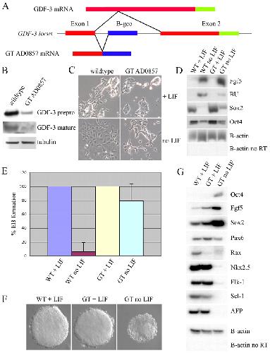 Fig. 5. GDF3 reduction of function through AD0857 genetrap in mouse embryonic stem cells. (A) Diagram of mouse Gdf3 genomic locus containing the AD0857 genetrap. The Gdf3 prepro domain (exon 1 and most of exon 2) is shown in red, GDF3 mature (exon 2) is shown in green, and the genetrap insertion is shown in blue. The RACE Tag for the genetrap contains most of exon 1 of GDF3. (B) Western blot of wildtype (WT) and AD0857 genetrap (GT) ES cells with pαGDF3 (top panel, prepro GDF3; middle panel, mature GDF3) and mαtubulin (bottom panel). (C) Morphology of WT and GT ES after 4 days of culture in the presence or absence of LIF (Ã10). (D) RT-PCR of WT and GT ES after 4 days of culture in the presence or absence of LIF. FGF5 is a marker of pluripotent epiblast. BU is a marker of mesoderm. SOX2 and OCT3/4 are markers of the undifferentiated state. β-actin is used as a loading control. (E) Graph showing the percentage of hanging drops containing cells of each condition (WT and GT with and without LIF) that formed EBs. (F) Day 2 EBs for wild-type cells cultured in the presence of LIF, and genetrap AD0857 cells cultured in the presence or absence of LIF (Ã10). (G) RT-PCR of markers for early embryonic cell fates on day 7 suspension culture EBs. The following markers were used: OCT4 (stem/epiblast), FGF5 (epiblast), SOX2 (stem/epiblast/neural precursor), PAX6 (neural), RAX (anterior neural), NKX2.5 (cardiac mesoderm), FLK1 (endothelial mesoderm), SCL1 (blood), AFP (endoderm), β-actin (loading control). No RT control is shown forβ -actin.