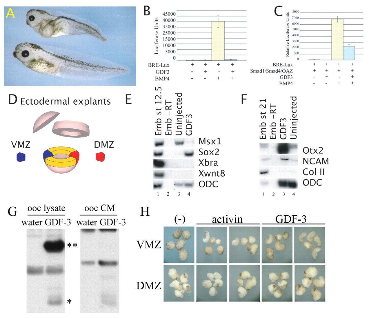 Fig. 2. GDF3 acts as a BMP inhibitor in frog embryos and mouse pluripotent cells. (A) Stage 41 embryos injected with 2 ng GDF3 RNA in the VMZ at the 4-cell stage (upper embryo) or uninjected sibling embryo (lower embryo). (B) Luciferase units of total embryo lysate from frog embryos injected with BRE-Lux and GDF3, BMP4 or both RNAs. (C) Relative luciferase units (luciferase:renilla) from total cell lysate of P19 cells transfected with BRE-Lux and the BMP signaling components Smad1, Smad4 and OAZ and Gdf3, Bmp4 or both. (D) Diagram of frog embryo showing ectodermal explant (animal cap), and VMZ and DMZ. (E,F) RT-PCR of GDF3-injected and uninjected animal caps matured to sibling stage 12.5 or stage 21 with whole embryo as positive control and whole embryo with no RT (-RT) as a negative control. ODC is shown as a loading control. (G) GDF3 protein produced in oocytes injected with either water or GDF3 RNA (50 ng). Oocyte CM was collected and oocytes were lysed at the end of culture (lysate) and western blot was performed with pαGDF3. The prepro form (**) of GDF3 is 45 kD and the mature form (*) is 18 kD. (H) VMZ and DMZ explants cultured in 0.5à MMR (-), in the presence of activin protein secreted from oocytes (diluted 1:50 or 1:500), or in the presence of GDF3 protein secreted from oocytes (diluted 1:100 or 1:1000).