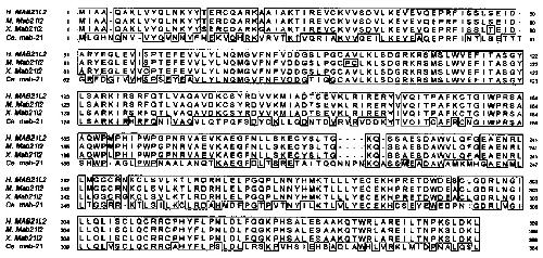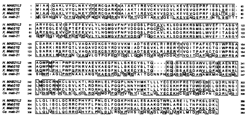 FIG. 1. Sequence alignment of Mab21 homologs in both invertebrate and vertebrates; worm (Ce), human (H), mouse (M), and Xenopus