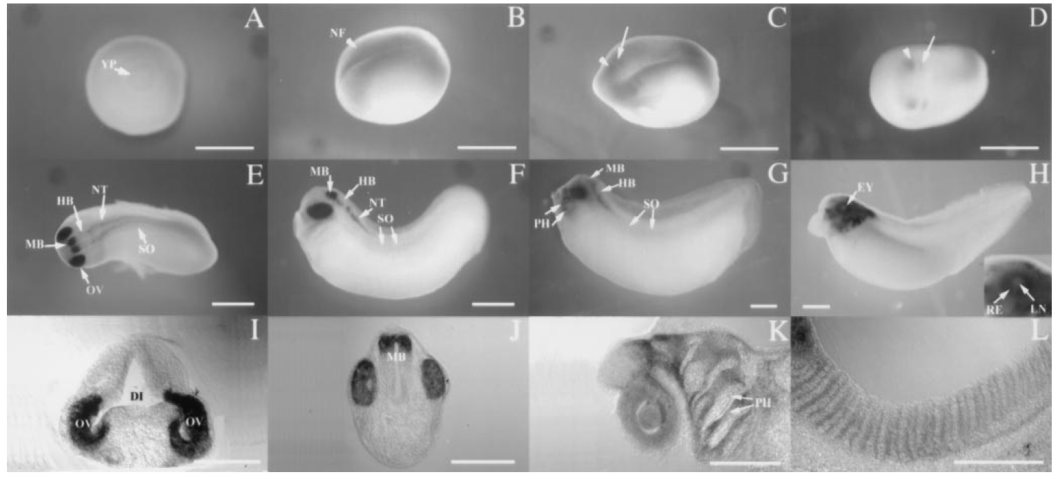 17/18, (E, I) stage 25, (F, J, L) stage 28/29, (G, K) stage 32, (H) stage 37/38. (EY, eye; DI, diencephalon; HB, hindbrain; LN, lens; MB,