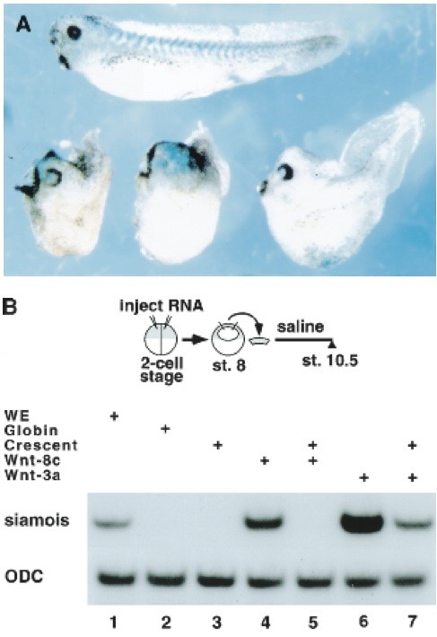 Figure 2.Crescent is an efficient Wnt-8 antagonist. (A) Crescent injection into one cell of a two-cell embryo enlarged anterior structures and inhibited posterior extension in injected Xenopus embryos (bottom series of embryos). Control embryos (top) were injected with globin mRNA. LacZ mRNA was in- cluded as a lineage tracer. (B) Crescent inhibited the induction of siamois by chick Wnt-8c in Xenopus animal caps. RTâPCR analysis of siamois and ornithine decarboxylase (ODC) expres- sion in whole embryos (WE; lane 1) or animal caps from em- bryos injected with the following RNAs: globin RNA (lane 2), 1 ng of crescent RNA (lane 3), 200 pg of chick Wnt-8c RNA (lane 4), 200 pg of chick Wnt-8c and 1 ng of crescent RNA (lane 5), 10 pg of mWnt-3a (lane 6), or 10 pg of mWnt-3a and 1 ng of crescent (lane 7). All injected RNA was made up to 1.2 ng with globin RNA. The difference between the levels of siamois expression in lanes 6 and 7 was approximately threefold, when normalized to ODC levels.