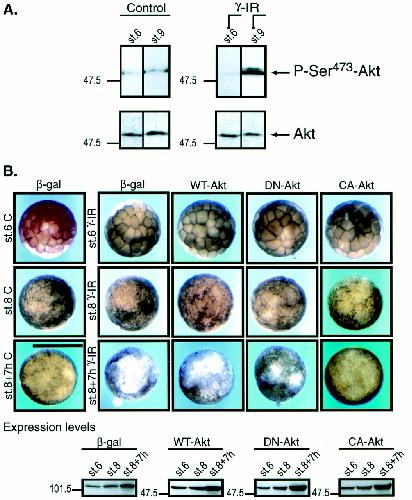 Apoptosis is controlled by a complex interplay between regulatory proteins. Previous work has shown that Xenopus embryos remove damaged cells by apoptosis when irradiated before, but not after, the midblastula transition (MBT). Here we demonstrate that Akt/protein kinase B is activated and mediates an antiapoptotic signal only in embryos irradiated after the MBT. In addition, an increase in xBcl-2/xBax oligomerization and a decrease in xBax homodimerization promote a protective effect against apoptosis only after the MBT. The post-MBT survival mechanism arrests cells in G(1) phase by increasing expression of the cyclin-dependent kinase inhibitor p27(Xic1). p27(Xic1) associates with cyclin D/Cdk4 and cyclin A/Cdk2 complexes to cause G(1)/S arrest, perhaps allowing more time for DNA repair. Taken together, the results define the DNA damage response as an element of the MBT and indicate that multiple mechanisms prevent apoptosis after the MBT.