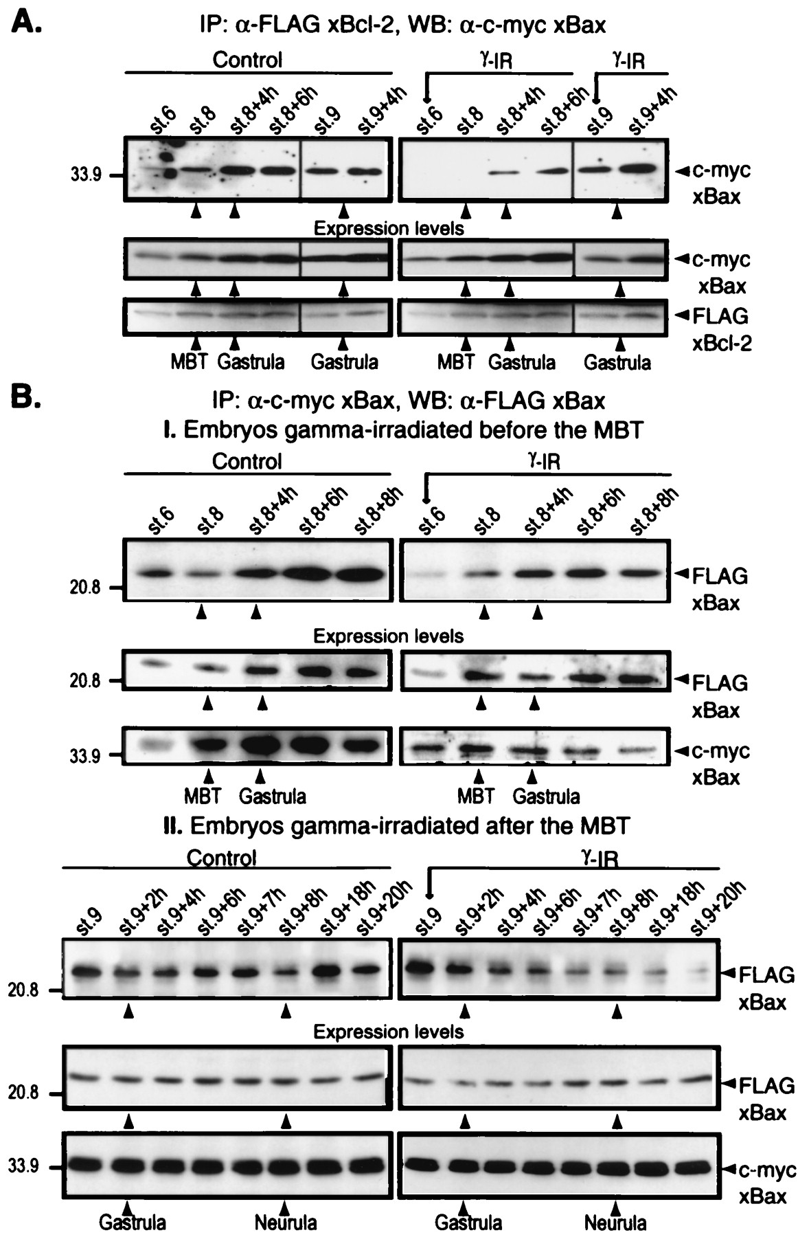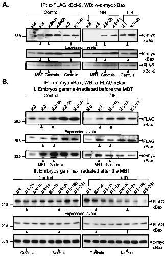 (A) Interaction between xBcl-2 and xBax changes at the MBT. Embryos were injected at the one-cell stage with a mixture of FLAG-tagged xBcl-2 and c-myc-tagged xBax mRNAs. The embryos were not irradiated (control) or were irradiated 3 h (stage 6) or 7 h (stage 9) after fertilization, collected at different times, and frozen. Samples equivalent to five embryos were immunoprecipitated with anti-FLAG M2-agarose beads, and the immunocomplexes were subjected to Western blot analysis with anti-c-myc antibody. (B) Analysis of xBax homodimerization. Embryos were injected at the one-cell stage with FLAG-tagged and c-myc-tagged xBax mRNAs, were not irradiated (control) or were irradiated at either stage 6 (I) or stage 9 (II), and were collected at different times. Samples equivalent to five embryos were immunoprecipitated with anti-c-myc-agarose beads, and the immunocomplexes were blotted with anti-FLAG M2 antibody (I, Top, and II, Top). Total FLAG-xBcl-2, FLAG-xBax, and c-myc-xBax expression levels were assessed at all stages by Western blotting with specific anti-tag antibodies (A and B, I and II, Middle and Bottom). Arrows on the right denote the FLAG-tagged or c-myc-tagged protein.
