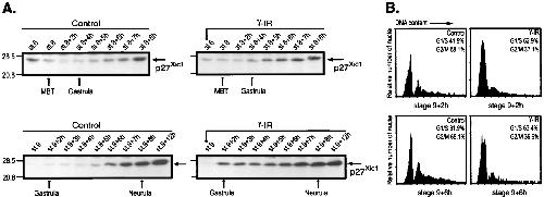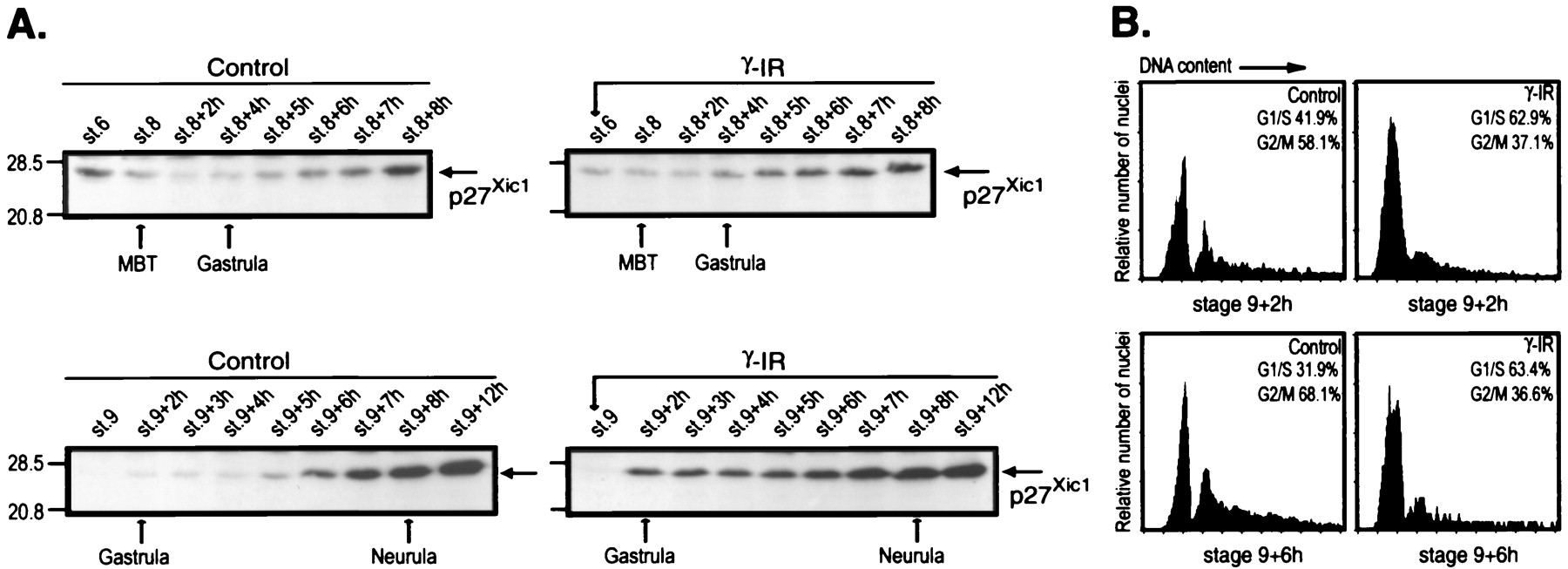 (A) Analysis of the level of p27Xic1 in embryos irradiated either pre- or post-MBT. Embryos were not irradiated (control) or were irradiated (γ-IR) at the indicated stages, and samples were collected at the indicated times and analyzed by Western blotting with anti-p27Xic1 antibody. One embryo equivalent was loaded per lane. (B) Cell cycle profile of irradiated embryos. Embryos were irradiated at stage 9 and collected 2 and 6 h after irradiation. Embryonic nuclei were prepared from a single sibling group and analyzed by flow cytometry as described in Materials and Methods. Stages of the cell cycle are defined by DNA content, as measured by fluorescence intensity.