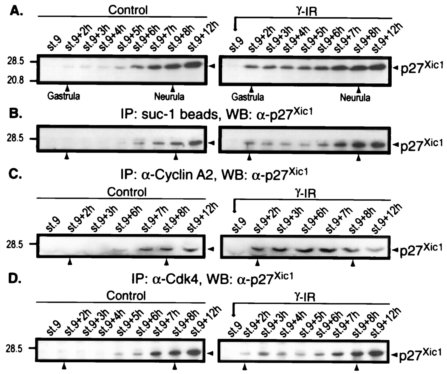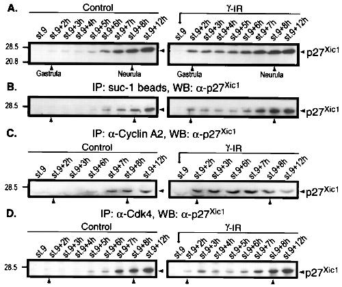 Targets for p27Xic1 in vivo. Embryos were not irradiated (control) or were irradiated after the MBT (stage 9 γ-IR), collected at different times, and frozen. (A) The total level of p27Xic1 at the indicated times. (B) Samples equivalent to five embryos were precipitated with p13suc-1 beads, and the bound proteins were analyzed by Western blotting with anti-p27Xic1 antibody. (C) Association of p27Xic1 with cyclin A2 complexes was detected by immunoprecipitation with cyclin A2 antibody and analysis of the precipitates by Western blotting with anti-p27Xic1 antibody. (D) Samples from embryos irradiated after the MBT were immunoprecipitated with anti-Cdk4 antibody and blotted with anti-p27Xic1 antibody.