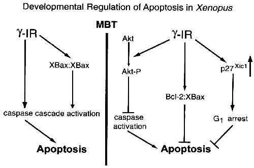Model of apoptosis regulation in Xenopus embryos. Ionizing radiation promotes apoptosis in embryos irradiated before the MBT by triggering different proapoptotic factors, including the homodimerization of xBax, and caspase cascade activation. Apoptosis is prevented in embryos irradiated after the MBT by the coordinated action of antiapoptotic stimuli. Survival signaling pathways act at at least three levels: by promotion of cell cycle delay by increasing the amount of p27Xic1 and its association with the complexes involved in the G1/S transition, by inactivation of proapoptotic molecules by heterodimerization, and by activation of antiapoptotic pathways like Akt.