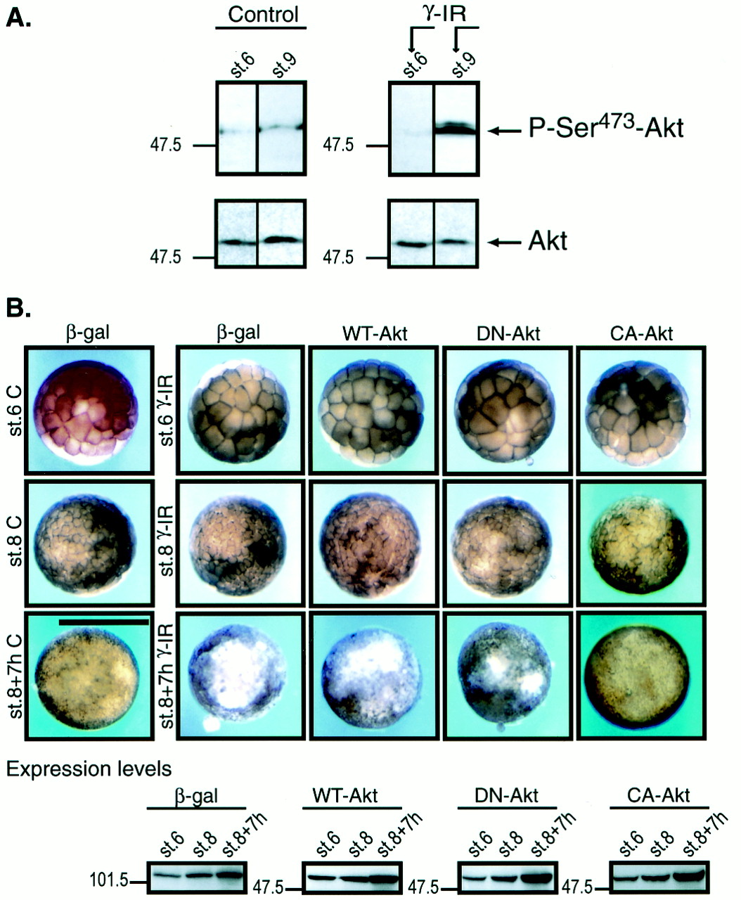 Phosphorylation of Akt in response to ionizing radiation. (A) Embryos were not irradiated (control) or were exposed to γ-IR at either stage 6 or stage 9, collected at different times, and analyzed as described in Materials and Methods. The blots were incubated with anti-P-Ser 473 Akt antibody (Upper) or anti-Akt antibody (Lower) and visualized by enhanced chemiluminescence. The arrows on the right denote the Akt protein and the phosphorylated isoforms. Molecular mass markers (in kDa) are indicated on the left. (B) (Upper) Embryos were injected at the one-cell stage with β-galactosidase, WT-, DN-, or CA-Akt mRNA and allowed to develop until they reached stage 6 (Top row). At that stage, embryos were not irradiated (first column on left) or were treated with ionizing radiation (γ-IR) and allowed to progress through early developmental stages. Embryos were collected and photographed at the time of irradiation (Top row, stage 6), at the MBT (Middle row, stage 8), and 7 h after the MBT (Bottom row), when the morphological changes of apoptosis were conspicuous (scale bar, 1 mm). (Lower) At the indicated stages, levels of the indicated expressed proteins were analyzed by Western blotting.