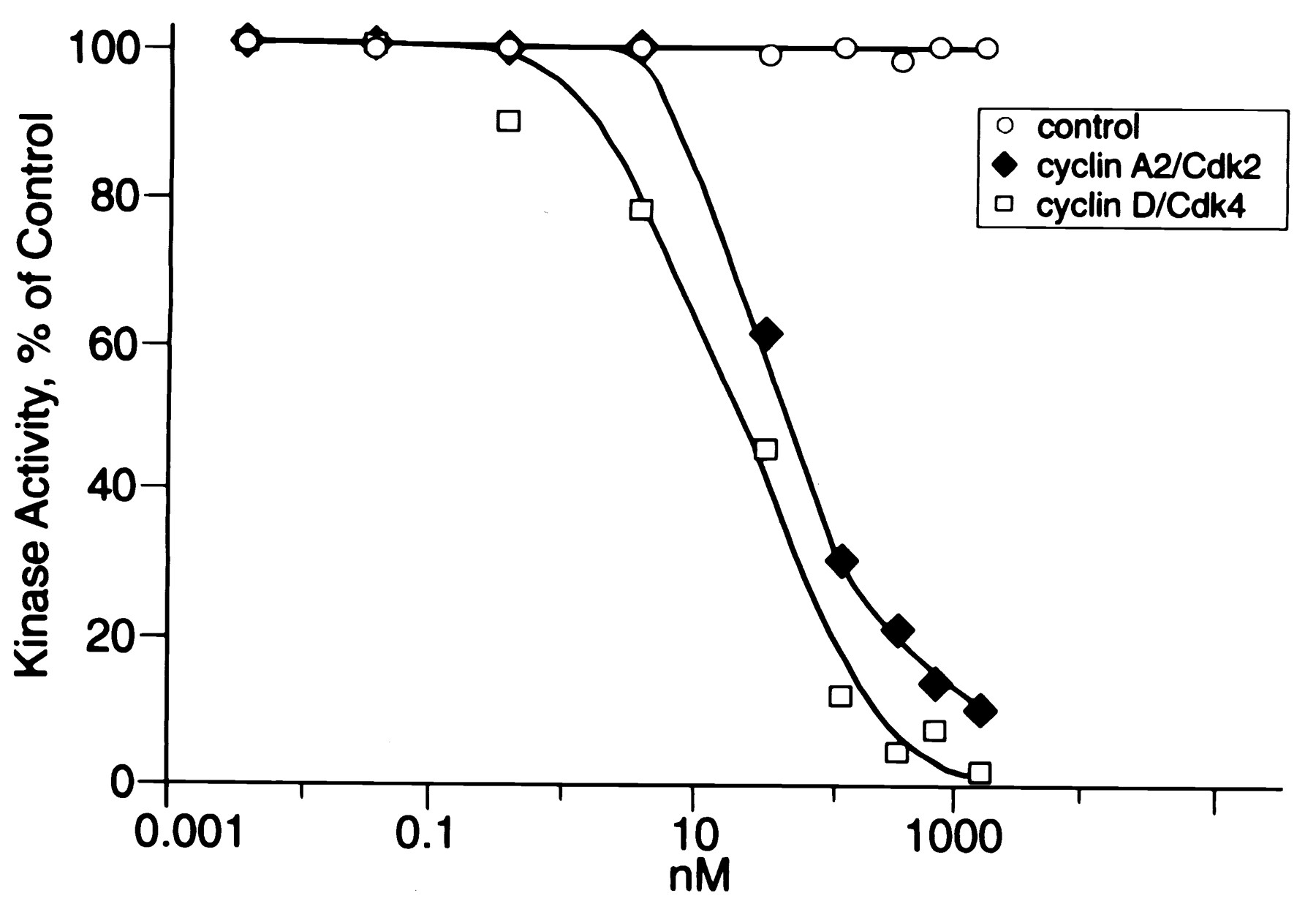 Inhibition of cyclin D/Cdk4 and cyclin A2/Cdk2 activity by p27Xic1. Purified cyclin D/Cdk4 or cyclin A2/Cdk2 complexes were preincubated with the indicated amounts of GST-p27Xic1 or GST alone (control), and the kinase reaction was performed with either the C-terminal half of human retinoblastoma protein (hRb) as substrate for Cdk4 or histone H1 for Cdk2, as described in Materials and Methods.