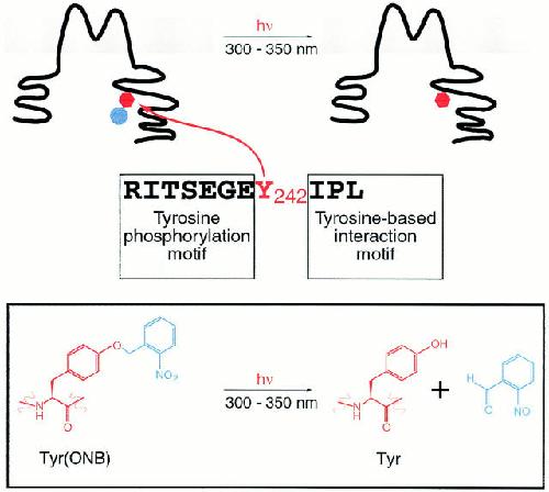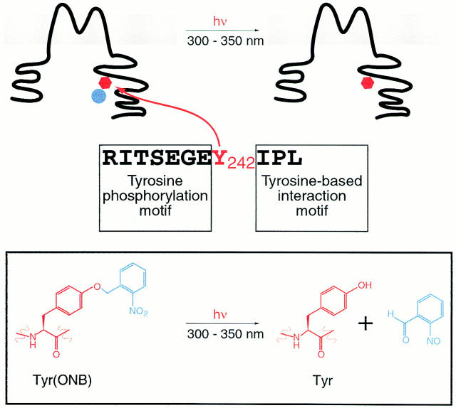 Tyrosine side chains participate in several distinct signaling pathways, including phosphorylation and membrane trafficking. A nonsense suppression procedure was used to incorporate a caged tyrosine residue in place of the natural tyrosine at position 242 of the inward rectifier channel Kir2.1 expressed in Xenopus oocytes. When tyrosine kinases were active, flash decaging led both to decreased K(+) currents and also to substantial (15-26%) decreases in capacitance, implying net membrane endocytosis. A dominant negative dynamin mutant completely blocked the decaging-induced endocytosis and partially blocked the decaging-induced K(+) channel inhibition. Thus, decaging of a single tyrosine residue in a single species of membrane protein leads to massive clathrin-mediated endocytosis; in fact, membrane area equivalent to many clathrin-coated vesicles is withdrawn from the oocyte surface for each Kir2.1 channel inhibited. Oocyte membrane proteins were also labeled with the thiol-reactive fluorophore tetramethylrhodamine-5-maleimide, and manipulations that decreased capacitance also decreased surface membrane fluorescence, confirming the net endocytosis. In single-channel studies, tyrosine kinase activation decreased the membrane density of active Kir2.1 channels per patch but did not change channel conductance or open probability, in agreement with the hypothesis that tyrosine phosphorylation results in endocytosis of Kir2.1 channels. Despite the Kir2.1 inhibition and endocytosis stimulated by tyrosine kinase activation, neither Western blotting nor (32)P labeling produced evidence for direct tyrosine phosphorylation of Kir2.1. Therefore, it is likely that tyrosine phosphorylation affects Kir2.1 function indirectly, via interactions between clathrin adaptor proteins and a tyrosine-based sorting motif on Kir2.1 that is revealed by decaging the tyrosine side chain. These interactions inhibit a fraction of the Kir2.1 channels, possibly via direct occlusion of the conduction pathway, and also lead to endocytosis, which further decreases Kir2.1 currents. These data establish that side chain decaging can provide valuable time-resolved data about intracellular signaling systems.