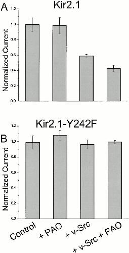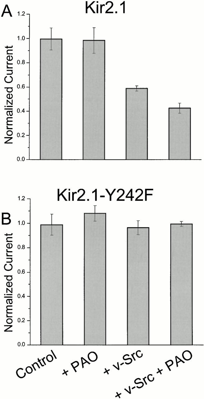 Figure 2. Whole-cell current from oocytes expressing Kir2.1 (A) and Kir2.1-Y242F (B). Data columns represent normalized currents (mean ± SEM, 4–5 oocytes). Where indicated, oocytes were coinjected with cRNA for tyrosine kinases v-Src or PyK2 and incubated with 10 μM PAO for at least 30 min before recording. 100% corresponds to 13.3 μA in A and 31.4 μA in B.