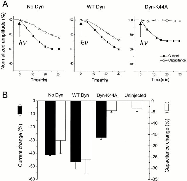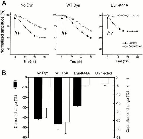 Figure 5. Dynamin expression distinguishes inhibition of the channel from endocytosis. (A) Current and capacitance data from representative oocytes coexpressing v-Src and Kir2.1-Y242TAG suppressed with Tyr(ONB) and treated with PAO. Data were recorded 48 h after injection. (Left) An oocyte without coinjected dynamin cRNA. (Center) An oocyte coinjected with 10 ng WT dynamin cRNA. The capacitance decrease for this cell was unusually large. (Right) An oocyte coinjected with 10 ng dominant negative dynamin-K44A. (B) Data for current and capacitance for oocytes recorded 30 min after irradiation (mean ± SEM, n = 5). Left-hand y-axis and full bars represent normalized current decrease. Average values (and ranges) for 100% were 4.1 (3.15–4.8), 3.1 (2.8–3.7), and 4.1 (3.0–5.7) μA for the three groups (left to right). Right-hand axis corresponds to hollow bars, representing normalized capacitance decrease. The rightmost column shows capacitance change of uninjected control oocytes. Average values (and ranges) for 100% capacitance were 197 (191–205), 225 (191–248), 189 (174–199), and 197 (190–209) nF for the four groups (left to right). Error bars represent SEM.