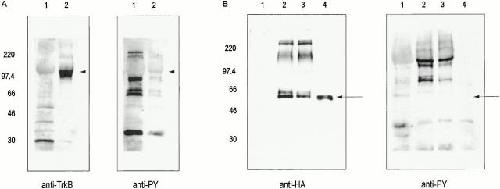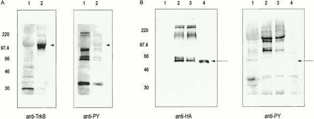 Figure 7. Western blotting shows that Kir2.1 appears not to be phosphorylated on tyrosine, where detection of TrkB phosphorylation serves as a control for the method. The experiment is typical of at least six similar results. (A) Western blot of membranes from oocytes expressing TrkB shows positive staining with both anti-TrkB and anti-PY antibodies. (Lane 1) Uninjected oocytes; and (lane 2) TrkB. Nitrocellulose blot is stained on the left with C14 anti-TrkB antibody, and on the right with 4G10 antiphosphotyrosine antibody. Lane 1 has been loaded with 50% more membrane protein than lane 2 (which received protein from membrane dissected from 21 oocytes), to emphasize the absence of an endogenous phosphorylated band at the position of TrkB. Arrowheads indicate TrkB. (B) Western blot of membranes from oocytes expressing epitope-tagged Kir2.1 shows positive staining with anti-HA antibody, but not with the antiphosphotyrosine antibody 4G10. (Lane 1) Uninjected oocytes; (lane 2) Kir2.1-HA; (lane 3) Kir2.1Y242F-HA; and (lane 4) Kir2.1-HA prepared by in vitro translation from wheat germ extract. Nitrocellulose blot is stained on the left with BAbCo HA.11 antihemagglutinin antibody, and on the right with 4G10 antiphosphotyrosine antibody. Arrows indicate Kir2.1. Lanes 1–3 contain protein from membranes dissected from 21–23 oocytes.