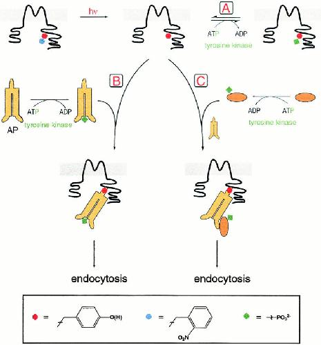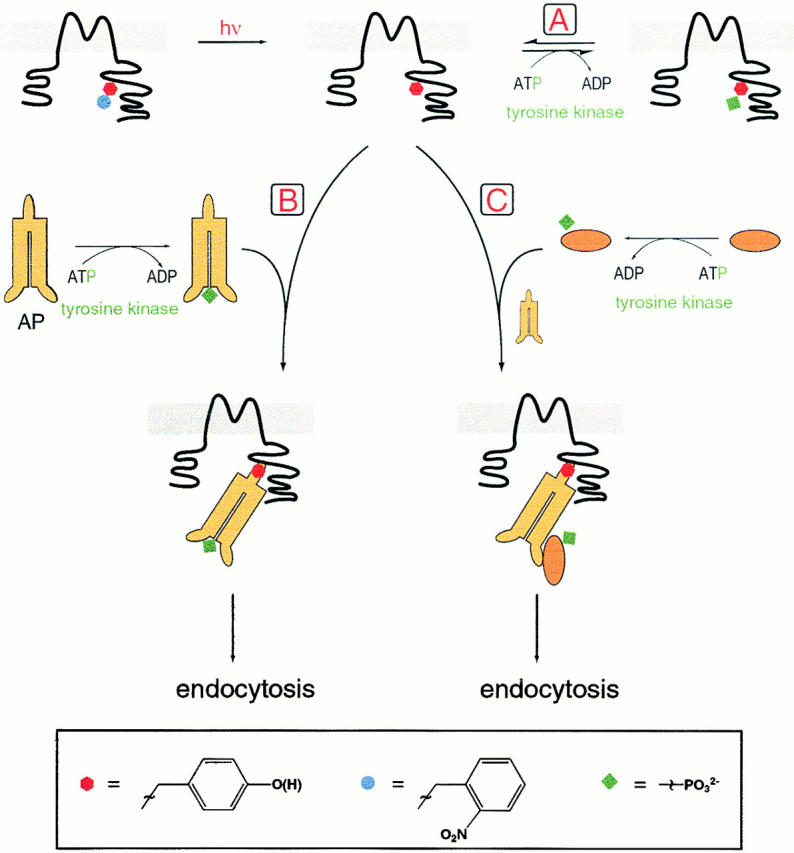 Figure 8. Schematic interpretation of the experiments. Irradiation leads to decaging of Tyr242 of Kir 2.1. Pathway A shows direct phosphorylation of the newly revealed tyrosine, which may be reversible/transient. Failure to observe phosphotyrosine directly makes this pathway unlikely. Pathways B and C involve the μ subunit of AP-1, AP-2, or AP-3 or a similar molecule. In pathway B the adaptor protein (AP) is phosphorylated, which enables it to bind to the now available tyrosine-based interaction motif of Kir 2.1 and inhibit the channel. Endocytosis follows. Pathway C includes phosphorylation of an unspecified protein, which, in combination with the adaptor protein, binds to and inhibits Kir 2.1 and leads to endocytosis.