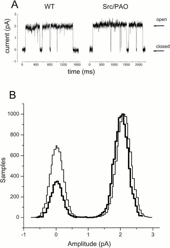 Figure 3. Conditions favoring tyrosine phosphorylation do not change single-channel conductance of WT Kir2.1. (A) Traces showing exemplar single-channel currents from cell-attached patches at −100 mV. The arrows point to the closed states and to the open states for control oocytes (left) and for oocytes coinjected with v-Src and treated with PAO (right). (B) Normalized all-points amplitude histograms for exemplar patches. Data from an oocyte injected with Kir2.1 alone are shown as heavy lines, and data from an oocyte injected with Kir2.1 + v-Src and exposed to PAO are shown as light lines.