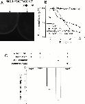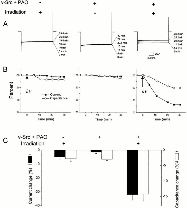 Figure 4. Inhibition of current and decrease of capacitance in oocytes expressing Kir2.1-Y242TAG suppressed with Tyr(ONB). (A) Typical current traces from individual oocytes. The left panel shows the effect of irradiating an oocyte (3 s at arrow) that is neither coexpressing v-Src nor exposed to PAO. The center panel shows the effect of coexpression of v-Src and exposure to PAO, but no irradiation of the oocyte. The right panel shows traces from an oocyte coexpressing v-Src, exposed to PAO, and irradiated. Oocytes were clamped at 0 mV and stepped to −80 mV to elicit an inward current. Bath solutions contained 96 mM KCl. Time after irradiation is shown. (B) Plots of current and capacitance versus time from the individual oocytes in A. (C) Averaged data from batches of oocytes recorded at t = 30 min. The filled bars correspond to the left-hand y-axis, indicating normalized current decrease. Average values (and ranges) for 100% current were 8.7 (5.5–13), 6.5 (4.5–10.4), and 6.6 (1.6–15.5) μA for the three groups (left to right). The hollow bars correspond to the right-hand y-axis, indicating capacitance decrease. Average values (and ranges) for 100% capacitance were 190 (159–227), 187 (167–202), and 194 (132–234) nF for the three groups (left to right). Error bars indicate SEM, n = 4–6 oocytes.
