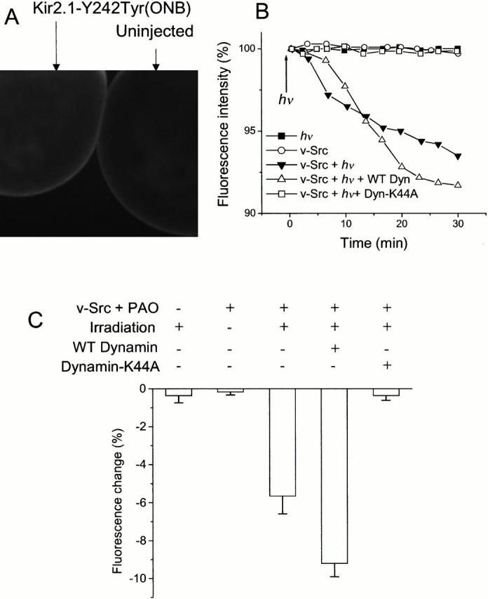 Figure 6. Fluorescence analysis of membrane retrieval. (A) Confocal image of two oocytes labeled with 10 μM tetramethylrhodamine-5-maleimide, a membrane-impermeant thiol-reactive fluorophore. The oocyte at left was injected with v-Src and Kir2.1-Y242TAG suppressed with Tyr(ONB). The oocyte on the right was not injected. (B) Fluorescence measurements for individual oocytes coexpressing v-Src and Kir2.1 Y242Tyr(ONB) and exposed to PAO. Oocytes were labeled with 10 μM tetramethylrhodamine-5-maleimide for 30 min before recording. Fluorescence is measured as PMT output voltage. As indicated, controls included omission of coinjected v-Src and omission of irradiation. (C) Normalized, average fluorescence change at t = 30 min for oocytes expressing Kir2.1-Y242TAG suppressed with Tyr(ONB) and treated with PAO, and then labeled with tetramethylrhodamine maleimide. The first column represents a control in which oocytes were not coinjected with v-Src. In all other columns, oocytes expressed the Kir2.1-Y242Tyr(ONB) along with v-Src. The second column represents a control in which oocytes were not irradiated. In the third column, no exogenous dynamin was added. The fourth column shows oocytes coexpressing WT dynamin. The fifth column represents oocytes coexpressing dynamin-K44A. Each bar represents six or seven oocytes. The average values (and ranges) for 100% fluorescence were 5.76 (3–9.5), 5.74 (3.5–7.2), 6.45 (3.7–9.5), 5.60 (3.93–6.92), and 5.62 (1–9.7) V.