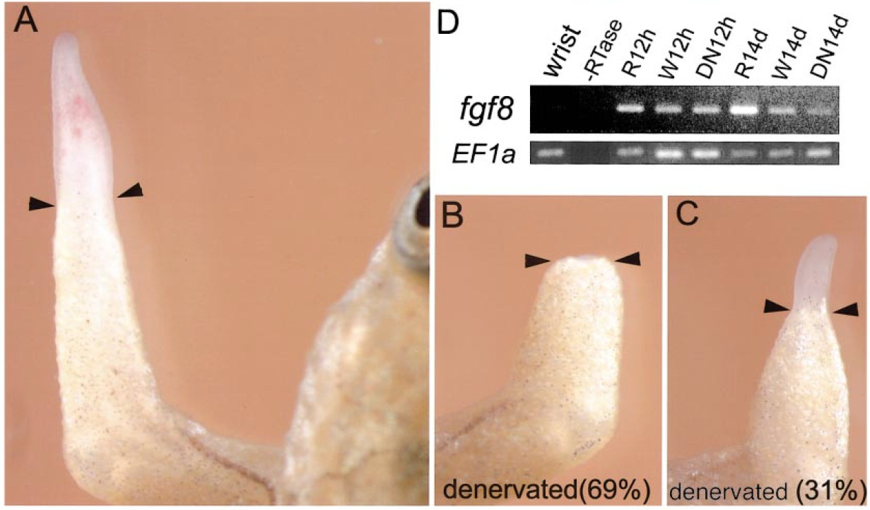 FIG. 2. Effect of denervation on spike formation and fgf8 expression. (A) A spike-like structure at 56 days after amputation. (B, C)