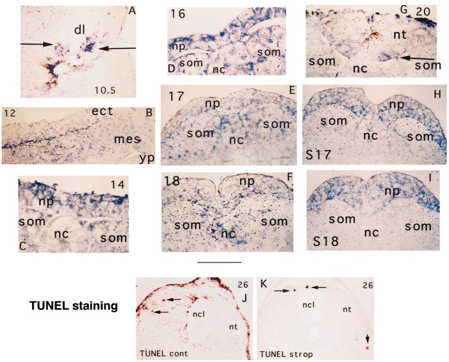 between stages 14 and 20. Comparisons between sibling embryos. Transverse sections. np, neural plate; nt, neural tube; nc, notochord; ncl,