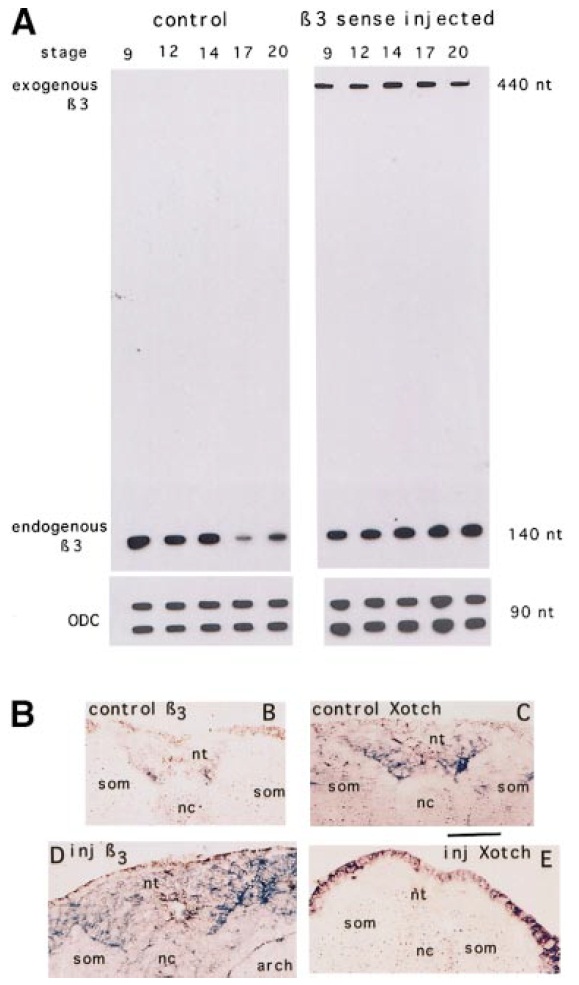 nt) and endogenous (140 nt) b3 transcripts). Control embryos reproduce the normal transient fall in b3 during the mid- to late neural fold