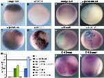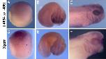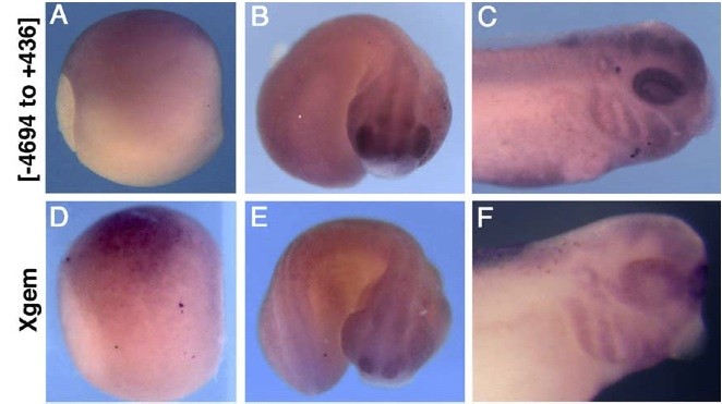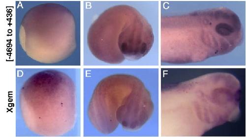 Fig. 1. Embryos transgenic for [-4694 to +436] express eGFP in a pattern that recapitulates endogenous geminin expression. Embryos were analyzed by in situ hybridization for eGFP (A C) or Xgem (D F) at st. 11.5 (A, D), st. 23 (B, E) and st. 35 (C, F). (A, D) Lateral views, dorsal up and anterior facing right. (B, C, E, F) Lateral views, dorsal up. (B, E) Embryos are curved with anterior structures facing out.