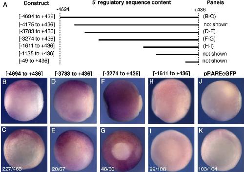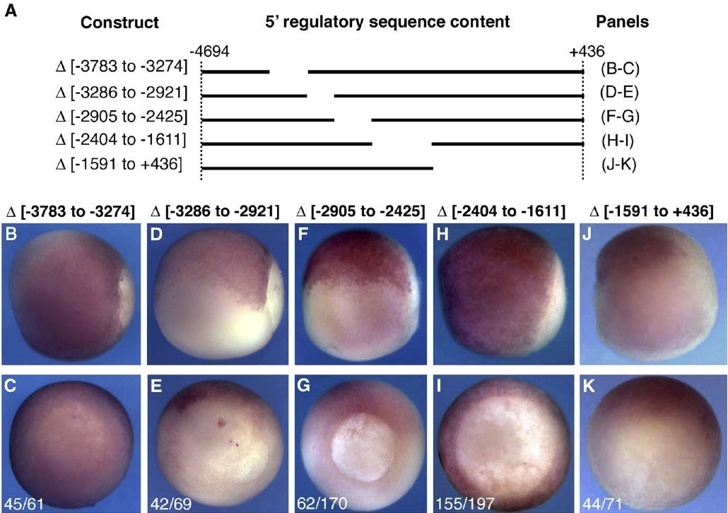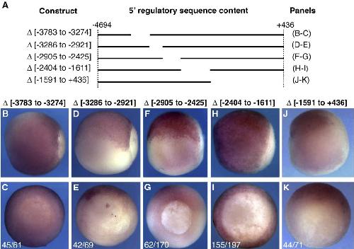 Fig. 3. Internal deletion series confirms the necessity of two 5V regulatory domains. Transgenic embryos carrying the constructs schematized in A were analyzed by in situ hybridization at st. 11.5 for the pattern of reporter expression. (B, D, F, H, J) Side views with posterior to the right and dorsal up. (C, E, G, I, K) Posterior views with dorsal up. (B, J, K) In situ for eGFP. (H, I) In situ for firefly luciferase. (C, E, G, I, K) Numbers represent the fraction of total embryos carrying the indicated construct that displayed the expression pattern shown.
