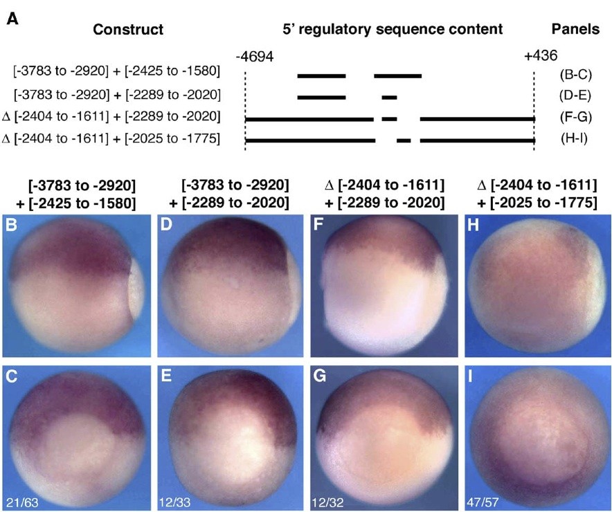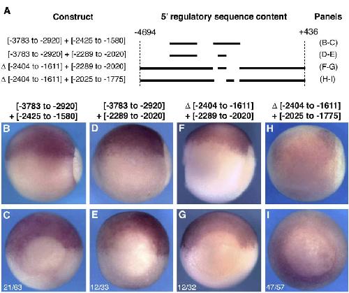 Fig. 4. Sufficiency of sequence domains to drive or restore dorsal-specific expression. Transgenic embryos carrying the constructs schematized in A were analyzed by in situ hybridization at st. 11.5 for the pattern of reporter expression. [-3783 to -2920] + [-2425 to -1580] and [-3783 to -2920] + [-2289 to -2020] were subcloned into pRAREsCMV. D[-2404 to -1611] + [-2289 to ô´2020] and D[-2404 to -1611] + [-2025 to -1775] were subcloned into pGL3basic. (B, D, F, H) Side views with posterior to the right and dorsal up. (C, E, G, I) Posterior views with dorsal up. (BâE) In situ for eGFP. (FâI) In situ for firefly luciferase. (C, E, G, I) Numbers represent the fraction of total embryos carrying the indicated construct that displayed the expression pattern shown.